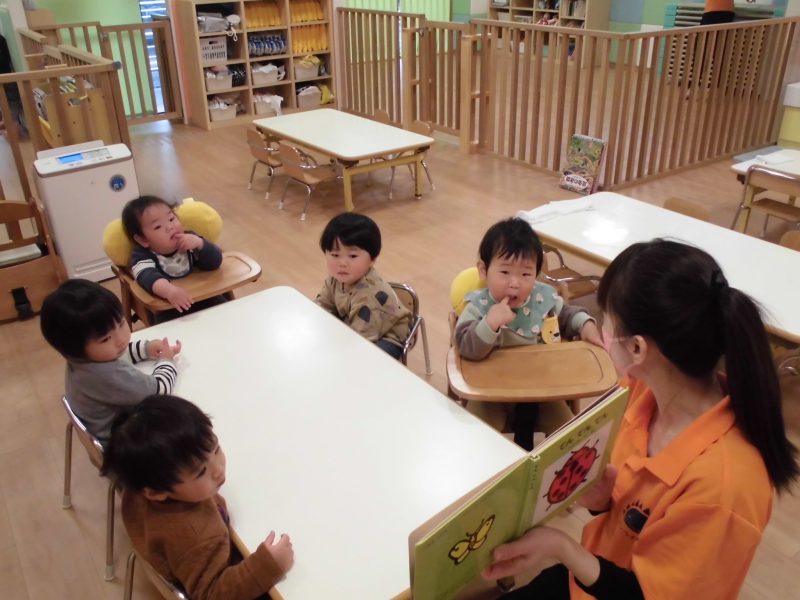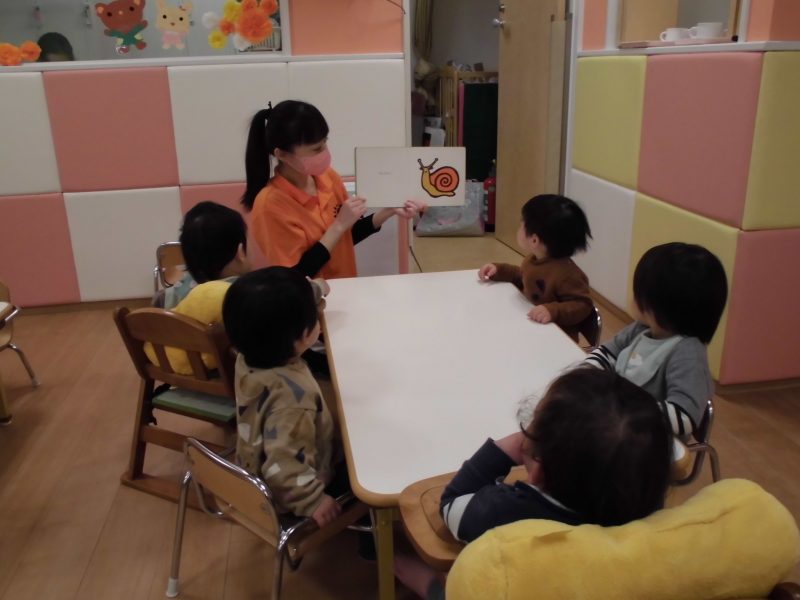 「てんてんてん てんとうむし」「ぐるぐるぐる かたつむり」とリズムをつけて読むと、子ども達も体を揺らして楽しんでいました![]()