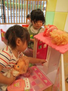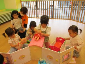女の子同士で集まると、お人形遊びになりドールハウスや美容院ごっこをして、髪を切ったりドライヤーをかけたり夢中になっていました![]()