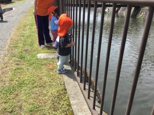 川に何かいないか探すことにも夢中の子どもたち?