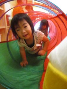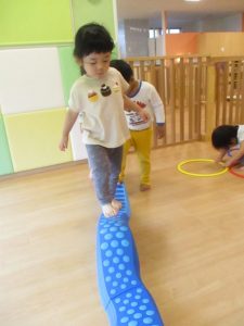りんごぐみは、フラフープに合わせて「けんけんぱっ」と楽しんだり、