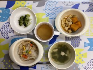 粥 味噌汁 ツナと野菜煮 高野豆腐とかぼちゃの煮物 ブロッコリーの塩ゆで