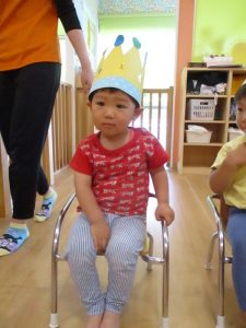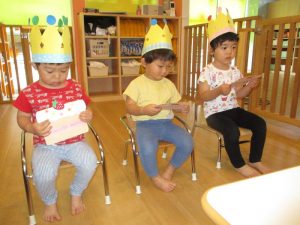 保育者から冠を被せてもらいお誕生日プレゼントのお誕生日カードをもらうと、「なんだろう?」と興味津々に見ていた子ども達