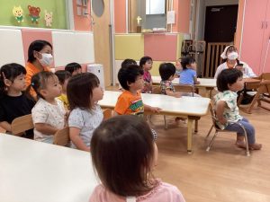 最後は、男の子がお風呂の玩具達に「いーれーてー!」と一緒にお風呂に、ばっしゃーん!その楽しそうな様子に大興奮の子ども達でした?