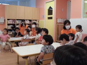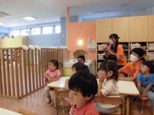 保育者の出し物のスケッチブックシアターが始まると、「なんだろうー?」とワクワクした様子の子ども達![]()