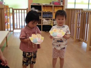 しながらもみんなに作品を見せてくれました?画用紙で作った織姫と彦星のお顔にクレヨンで目や口を描きました。お着物は、丸シールを貼って飾り付けとても素敵な織姫と彦星が出来上がりましたよ![]()