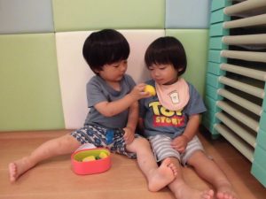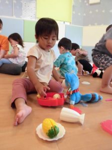 野菜や果物をお弁当箱に沢山詰めて、お友達とにあーん!と食べさてあげるとモグモグそのやりとりがとっても可愛くて心癒されました保育者にも食べさせてくれましたよ