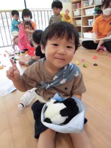 お気に入りぬいぐるみをハンカ抱っこしたチでくるむと、大事そうに抱っこして、ハンカチがおちてしまうと保育者に「やってー」と包み直してもらっていました