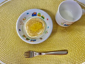 おやつのホットケーキにりんごジャムをかけると味が変わってよいですね。みんな口や手がベタベタになるくらい一生懸命食べてくれました♪