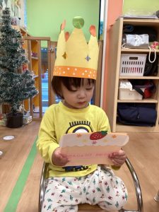 名前を呼ばれ前に出ると、ちょっぴり緊張した表情の子ども達でしたがみんなからお祝いの歌を歌ってもらったり保育者からお誕生日カードをもらうとニコニコ笑顔になっていました