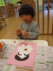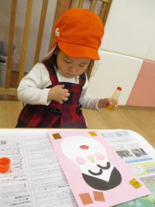 上手にのりをつけてペタンと飾りつけをしたり、のりの先端を触って「ぐみみたーい」と感触を楽しんでいる子もいました!