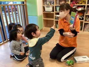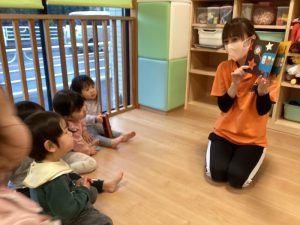 元気にバスが出発するといろいろなものに出会います!「のってくださーい」と読むと、「はーい!」と子ども達が手を挙げてお返事してくれました
