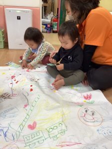 そんな中もも組は、大きな模造紙にクレヨンでなぐりがきとシール貼りをして楽しみました