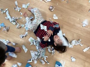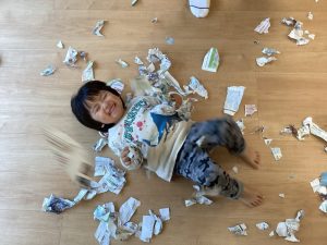 ビリビリ新聞紙を破いたり握って丸めてみたり感触を楽しみ、保育者がちぎった新聞紙を集めて上から降らすとキャッキャと笑って大喜びしていました![]()