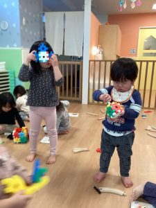 りんご組の子ども達は、小さいクラスのお友達ともよく遊んでくれます!一緒にブロックで何かを作ったり、「かわいい」と言って頭を撫でたり優しく接している姿に微笑ましく思います