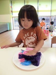 小さな指にたっぷりの糊をつけたら紙皿に塗って、