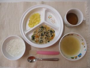 お誕生日メニューで、給食の鶏の唐揚げはみんなあっという間に食べ終わり、「唐揚げ!!」とおかわりしてくれました。おやつのココアパンケーキは、口いっぱいにホイップを付け、一生懸命食べている様子を見る事が出来ました♪