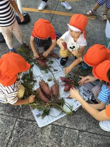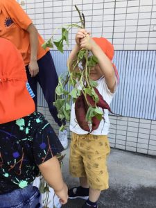 感触や匂いをかいでみたり、房から取り出してみたり、切る前と切った後の違いをみたり・・・さつまいもは実際に土から抜きました