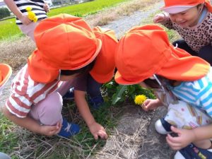」とタンポポのお花を摘んだり、虫探しをしてみたり