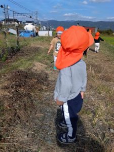 1歳児いちご組さんは、あぜ道で追いかけっこを楽しんだり、通過する電車に
