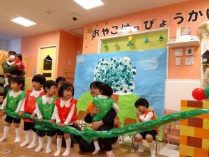 読み聞かせで子どもたちが興味を示した一冊の絵本「おおきなかぶ」の劇を披露