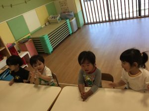 最後に「おーっ!」と手を挙げるのですが1歳児クラスも2歳児クラスもタイミングバッチリ![]()