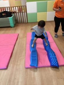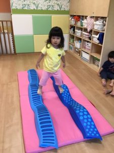 平均台から落ちないように慎重に渡っています