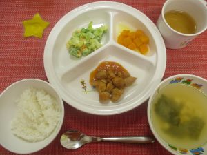 4月も後半になり、みんな落ち着いて給食を食べれるようになりました。たまに遊んでしまったり、泣いてしまったりもしてますが、先生やお友だちの優しい声掛けや見守りにより成長の糧になっています。食を通しても一歩一歩成長につながっていきますように♪