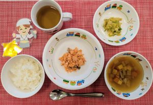 今日の給食は、鮭の塩焼きです!子どもたちは魚料理も好きです。