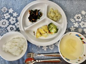 給食を食べ終わった園児がまだ食べている園児を見守っている様子が見れました。後から入園した子も早く園に慣れるといいな、、