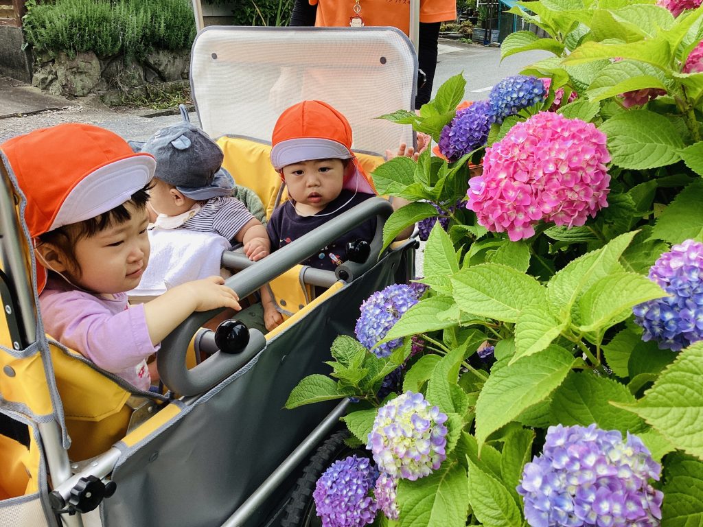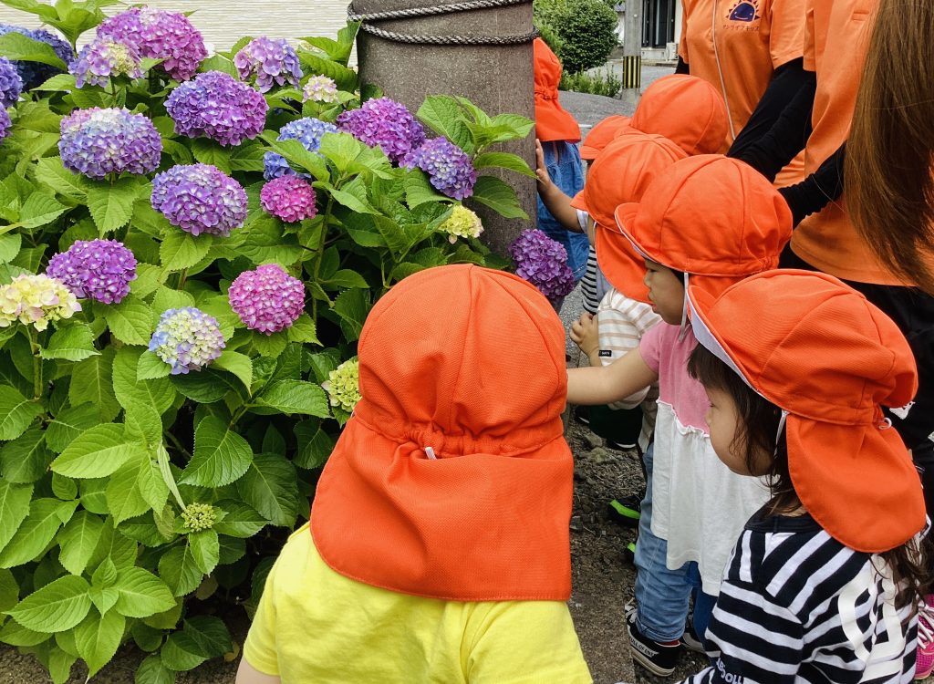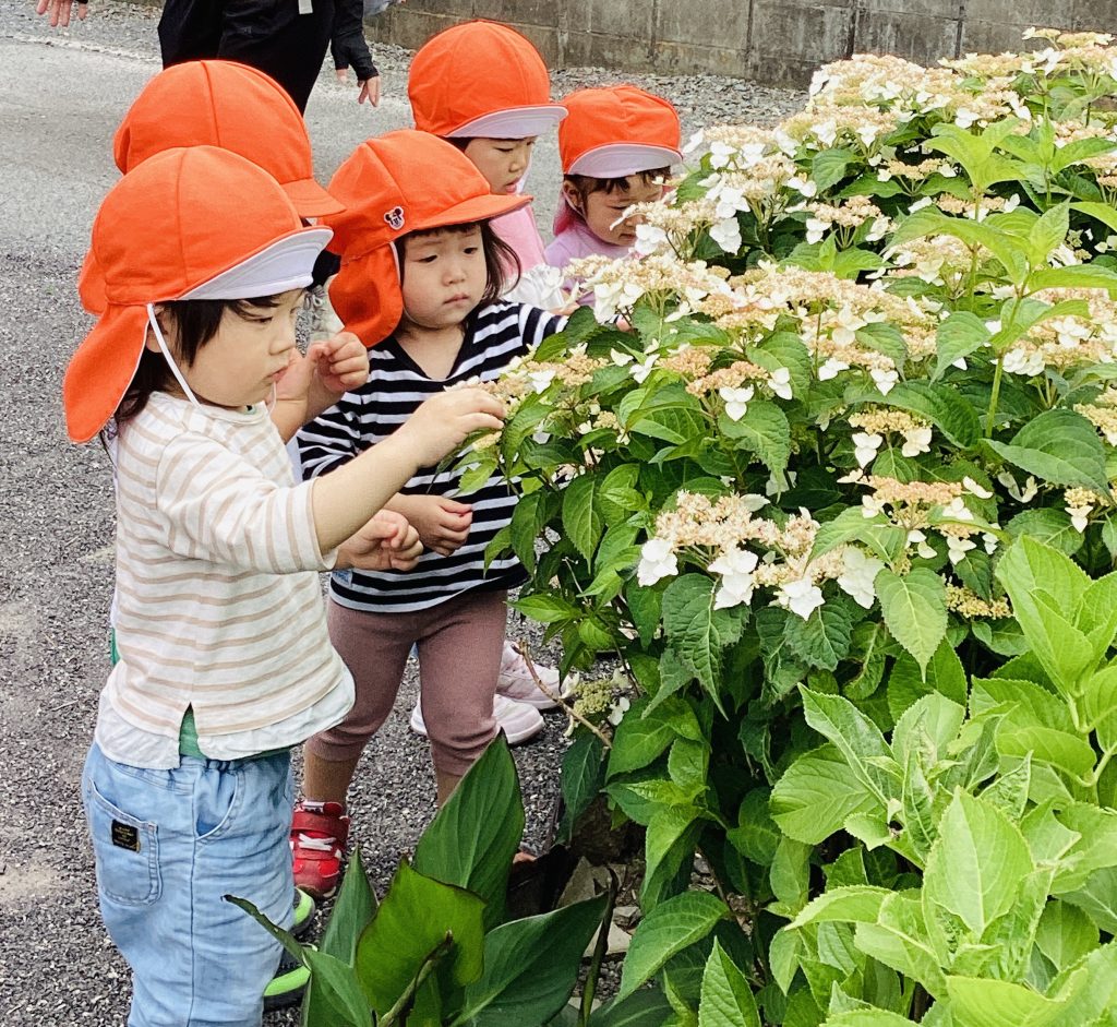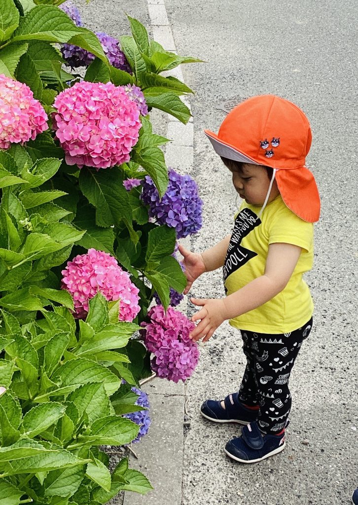 紫陽花をそおっと触っている子ども達😊