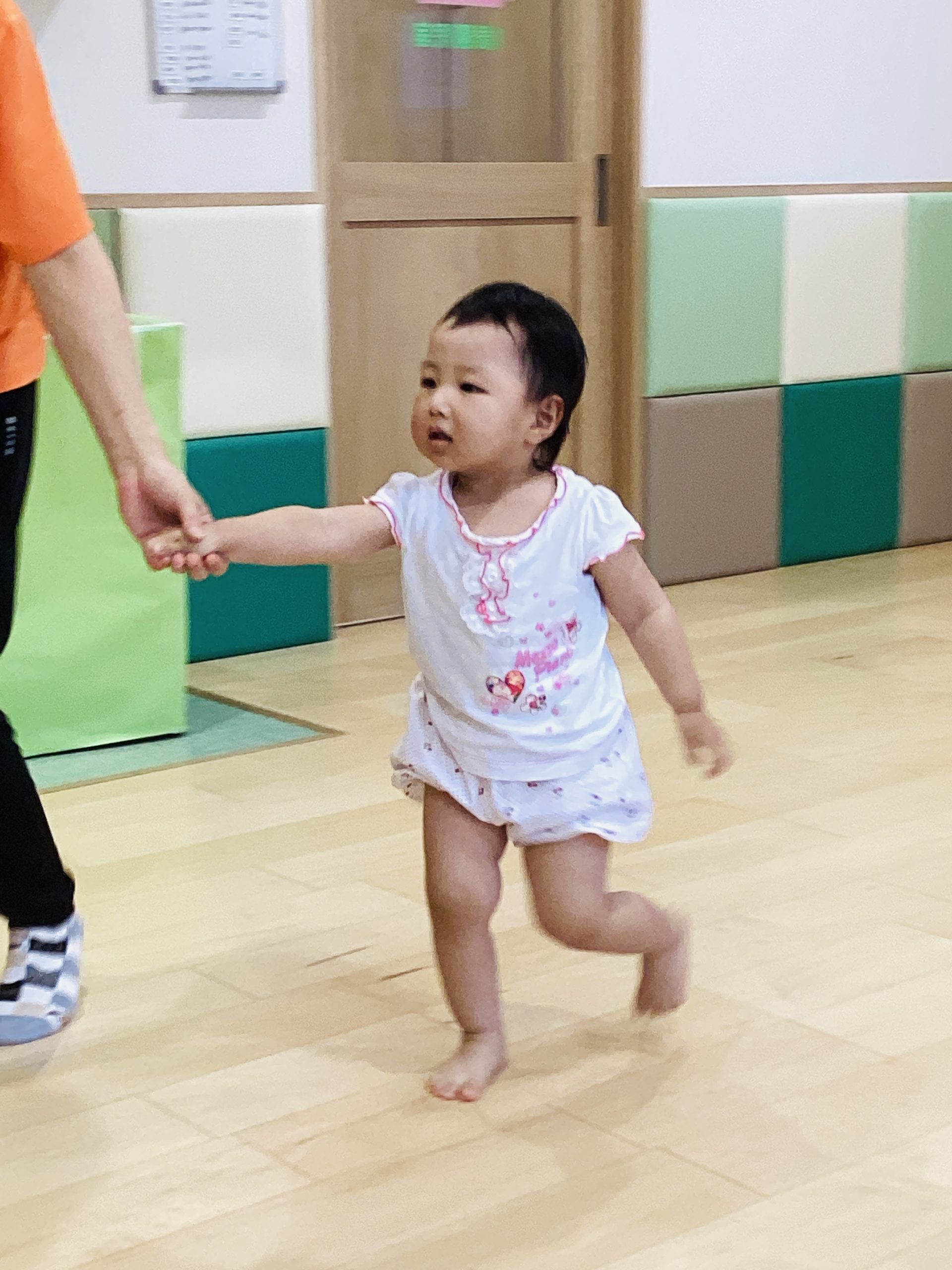 保育者と一緒に手を繋いでよーいドン!
