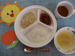 (写真は中期食です。月齢によって形、固さ、盛り付け量を変えて提供しています。)