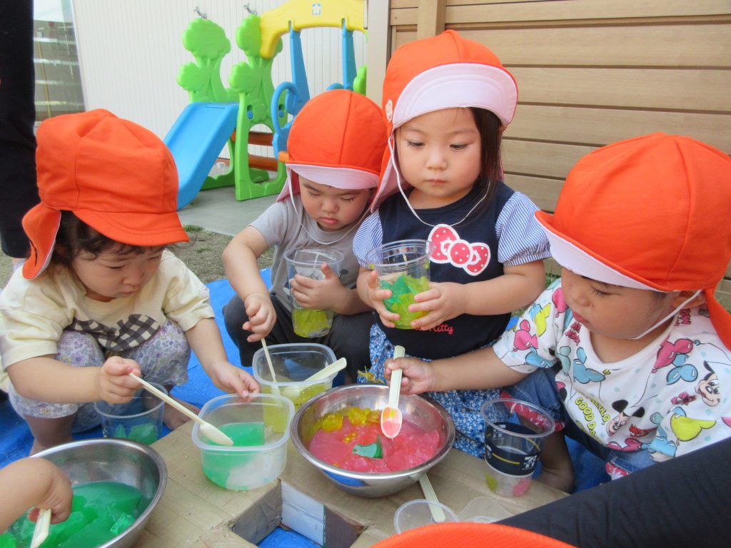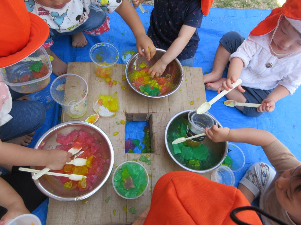 寒天を手でつぶす感触を味わった後は