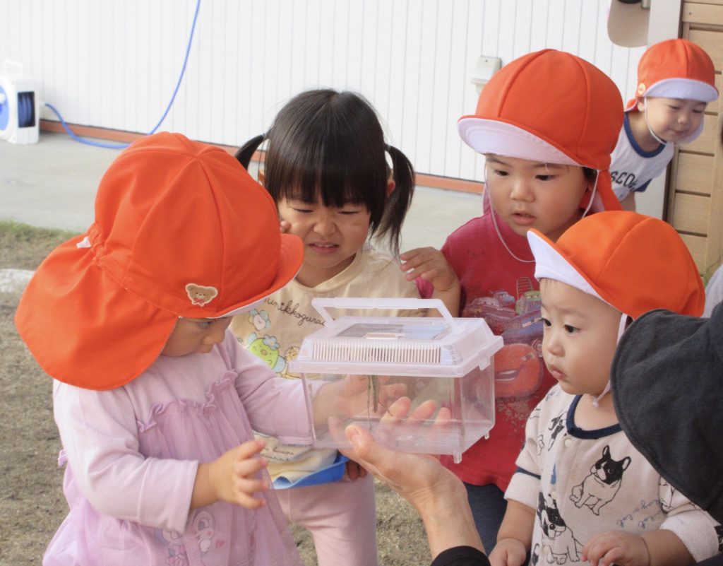 カゴに捕まえたバッタさんをまじまじ観察会👀