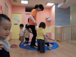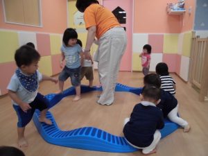 保育士にも平均台から落ちないように手を