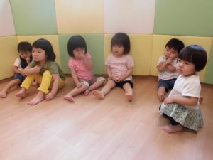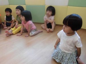 英語遊びの準備を待つ子どもたち。