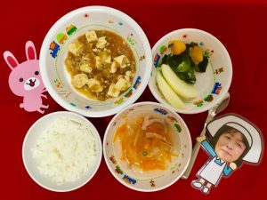 本日のお給食です♪ ★ご飯 ★麻婆豆腐 ★中華スープ ★酢の物...