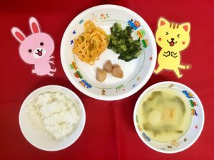 本日のお給食です♪ <普通食> ★ご飯 ★味噌汁 ★照り焼きチキン ★スパゲッティソテ...