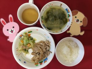 本日のお給食です♪ <普通食> ★ご飯 ★味噌汁 ★生姜焼き ★おくらとキャベツのごま酢和え &nb...