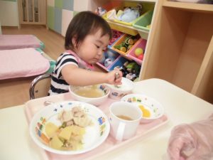 朝のおやつも手遊びや絵本を真剣な顔で