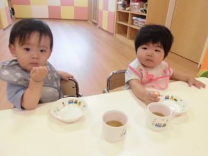 朝のおやつも手遊びや絵本を真剣な顔で