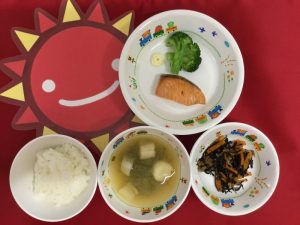 本日のお給食です♪ ★ご飯 ★わかめの味噌汁 ★鮭の塩焼き ★ひじきの炒...
