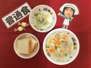 本日のお給食です♪ <普通食> ★食パン ★チキンクリームシチュー ★混ぜ混ぜサラダ ★チーズ <離...