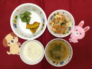 本日のお給食です♪ ★ご飯 ★かぶのみそ汁 ★マーボー豆腐 ★梅和え ★かぼちゃの素揚げ