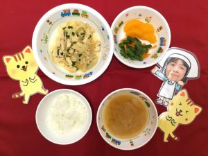 本日のお給食です♪ ★ご飯 ★玉ねぎのみそ汁 ★鶏肉のすき焼き風 ★おかか和え ★みかん缶 &nbs...