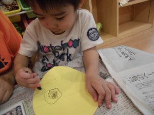 何やら変わった形の紙ににお顔を描いて…
