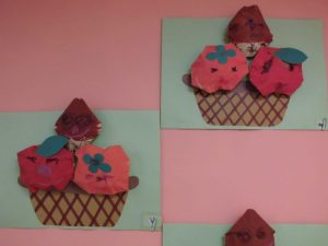 何やら変わった形の紙ににお顔を描いて…