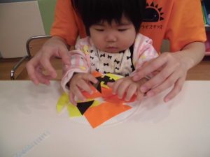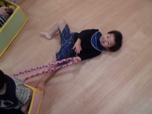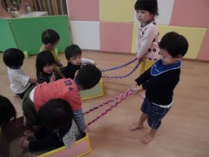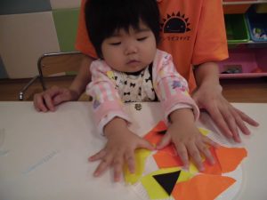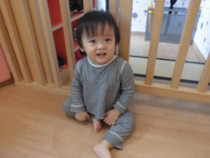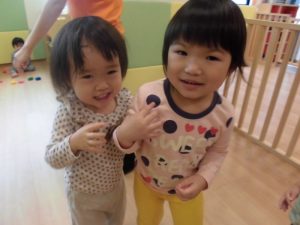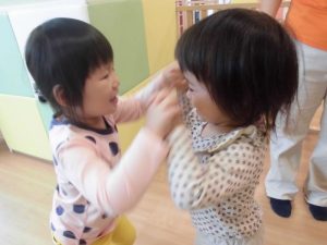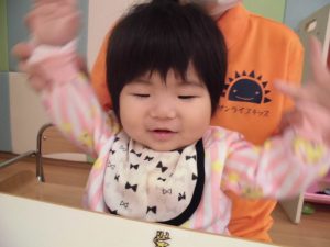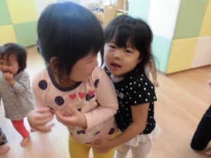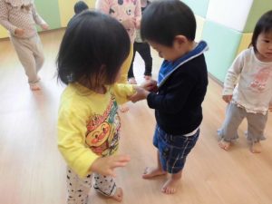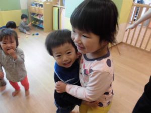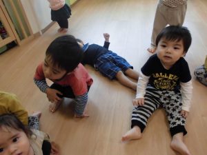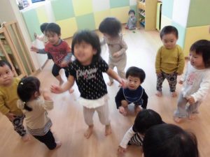 保育者の真似をして「ぱっ!」と手を広げ立つ、