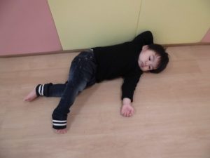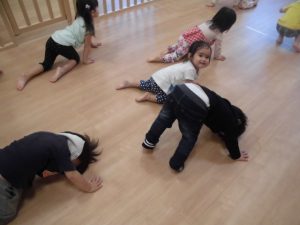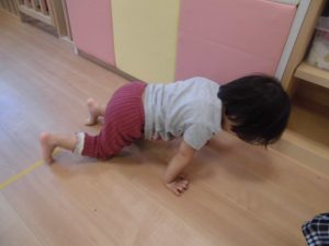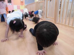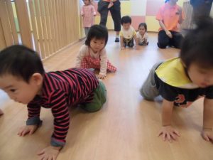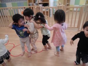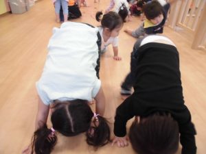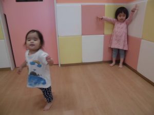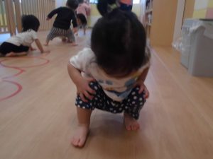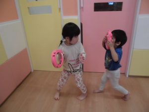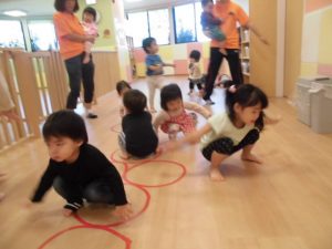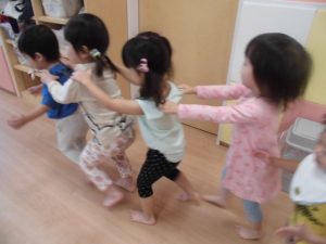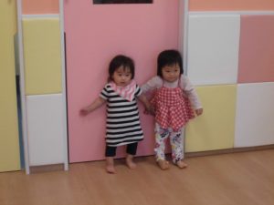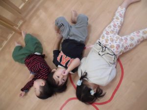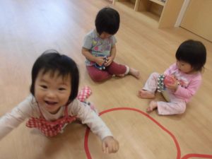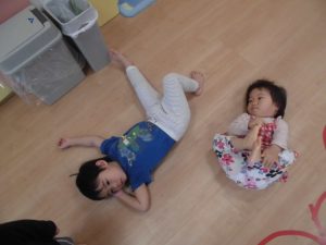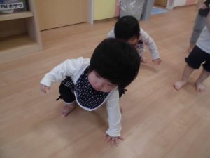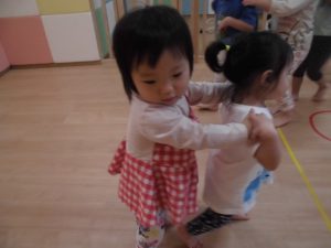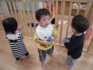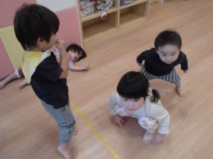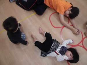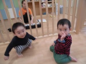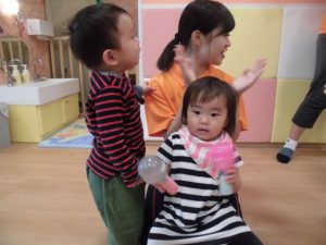 お兄ちゃんお姉ちゃん、保育者の姿を見ながら