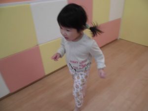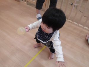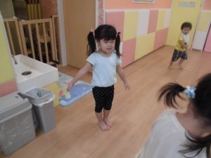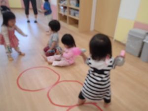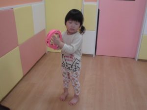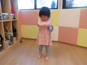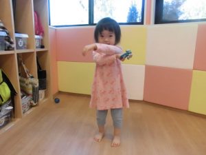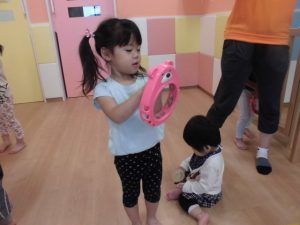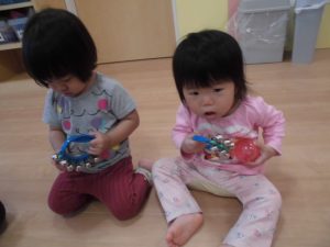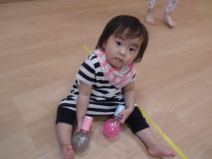保育者に「チャチャチャに合わせて鳴らしてみて」と